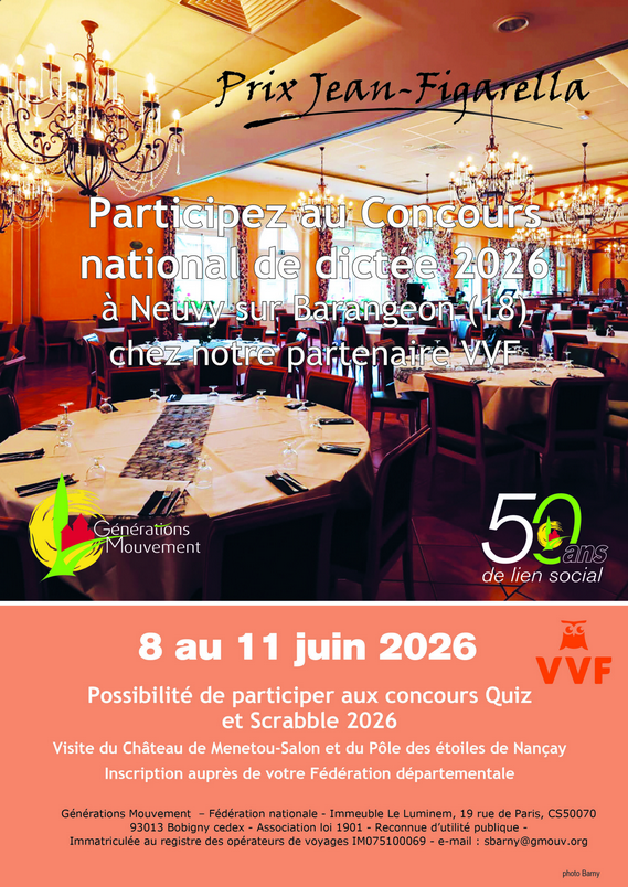 Le Concours national de dictée 2026 aura lieu chez notre partenaire VVF, à Neuvy-sur-Barangeon dans le Cher, du 8 au 11 juin 2026.