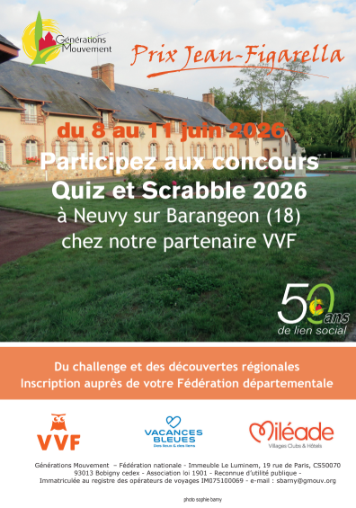 Les concours nationaux de Quiz et Scrabble Duplicate 2026 auront lieu, comme le concours Dictée 2026, chez notre partenaire VVF, à Neuvy-sur-Barangeon, dans le Cher, du 8 au 11 juin 2026.